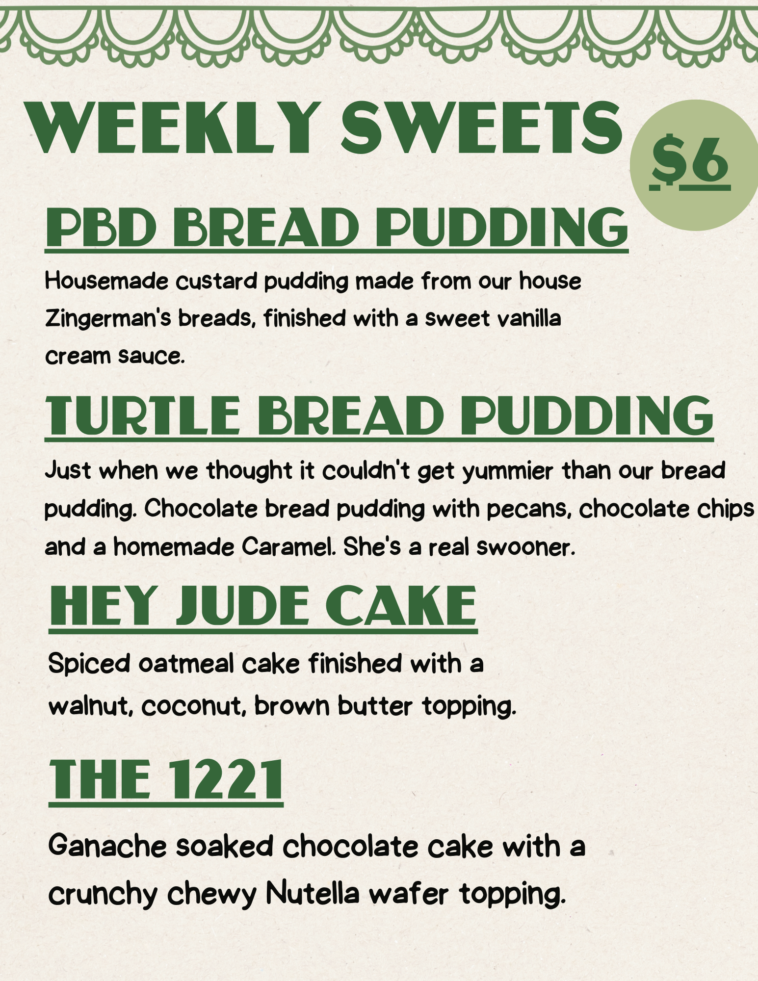 Housemade custard pudding made from Zingerman’s breads, finished with a sweet vanilla cream sauce.